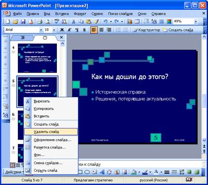 Для того чтобы удалить слайд, выделите его эскиз в области структуры и нажмите клавишу клавиатуры Delete. Можно также щелкнуть по эскизу слайда в области эскизов правой кнопкой мыши и выбрать команду Удалить слайд (Рисунок 14).