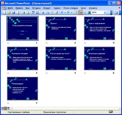 Для изменения порядка слайдов в презентации удобно пользоваться режимом отображения Сортировщик слайдов (Рисунок 15). Для перехода в этот режим выполните команду Вид/Сортировщик слайдов.