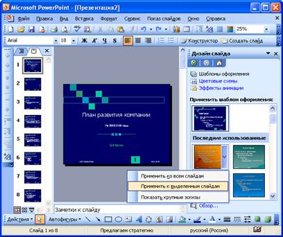 Шаблон оформления можно применить не только сразу ко всей презентации, но и к отдельным выделенным слайдам. Для этого в области задач Дизайн слайда щелкните по эскизу шаблона правой кнопкой мыши и выберите команду Применить к выделенным слайдам (рис. 37.2).