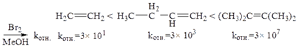 Если в реакциях электрофильного присоединения образуется циклический интермедиат 2, то введение алкильных заместителей в молекулу этилена приводит к аддитивному ускорению скорости реакции до тех пор, пока все 4 атома водорода не будут замещены на алкильные группы. Наблюдаемая аддитивность является одним из доказательств образования циклического интермедиата типа 2: