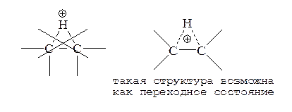 Если электрофильное присоединение идет через открытый карбокатион (например, присоединение гидрогалогенидов), то винильный карбокатион 9 энергетически менее выгоден по сравнению с алкильным карбокатионом 1: