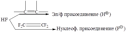 Известны случаи, когда один и тот же реагент с простыми олефинами реагирует только по электрофильному механизму, а с полигалогено- или полицианоолефинами – по нуклеофильному: