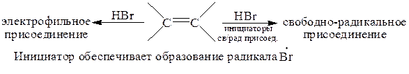 Свободнорадикальное присоединение может происходить с субстратами любых типов. Главное условие такого присоединения – присутствие в реакционной смеси свободнорадикальных частиц. Такие реагенты, как, например HBr, RSH атакуют по ионным механизмам в отсутствие инициатора, но в его присутствии механизм присоединения меняется на свободнорадикальный: