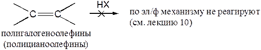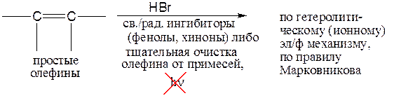 В присутствии пероксидов присоединение HBr к простым олефинам идет по свободнорадикальному механизму с ориентацией против правила |Марковникова. Присоединение HI и HF по свободнорадикальному механизму никогда не наблюдается даже в присутствии перекисей. Свободнорадикальное присоединение HCl реализуется лишь в редких случаях, поскольку энергетически невыгодно.