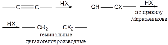 К тройной связи можно присоединить 1 или 2 моля HX. Второе присоединение идет медленнее первого из-за электроноакцепторного действия брома, поэтому реакцию можно остановить на первой стадии. В соответствии с правилом Марковникова всегда получаются геминальные дигалогены, а не вицинальные изомеры: