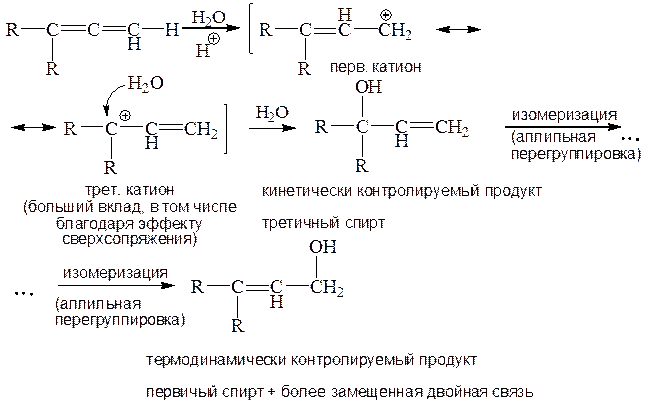 При гидратации несимметричных арилалленов, геминальных диалкилалленов и триалкилалленов возникает вопрос о региоселективности (региоспецифичности) присоединения к аллильному катиону гидроксильного остатка, т. е. куда входит нуклеофил на второй стадии присоединения (аллильный катион является мезомерным амбидентным катионом). Вероятно, первоначальная атака аллильного катиона направлена по положению с наибольшей плотностью положительного заряда, с образованием продукта кинетического контроля. Однако этот продукт далее ионизируется по SN1-механизму, и образовавшийся аллил-катион атакуется водой по менее замещенному концевому углероду аллильной системы, с образованием более стабильного по сравнению с третичным спиртом первичного или вторичного спирта (более стабильного по сравнению со вторичным спиртом первичного спирта в случае присоединения к арилаллену). В итоге присоединение происходит против правила Марковникова.
