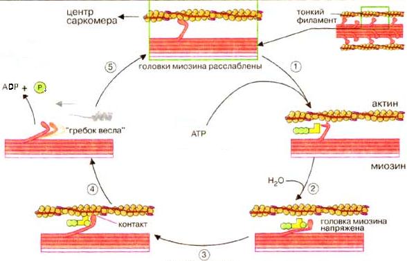 4. Актин ускоряет выброс продуктов АТФ-азной реакции из активного центра миозина. Это приводит к преобразованию аллостерического напряжения и изменению конформации головки миозина, которое действует подобно «удару весла» (модель весельной лодки). Во время этого «гребка» миозиновые головки отклоняются на определенный угол от оси и перемещают миозиновый филамент вдоль актинового филамента по направлению к Z-диску. Цикл повторяется до тех пор, пока имеется АТФ.