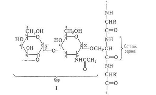 ГЛИКОПРОТЕИНЫ – соединения, в молекулах которых остатки олиго- или полисахаридов связаны с полипептидными цепями белка ковалентно (О- или N-гликозидными связями). Гликопротеины широко распространены не только в соединительной ткани, но и в природе в целом. К ним относят компоненты плазмы крови (иммуноглобулины, трансферрины...), вещества, определяющие группу крови, некоторые гормоны, лектины, ферменты, антигены многих вирусов (гриппа, кори, энцефалита...).