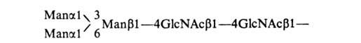 N-гликозидная углевод-белковая связь образуется с участием N-амидной группы аспарагина в полипептидной цепи, т.е. N-гликозилпротеины связаны гликозил-амидными связями. В гликопротеинах с атомом N амидной группы аспарагина соединен N-ацетилглюкозамин. В этом случае кор углеводной цепи гликопротеинов – пентасахарид: