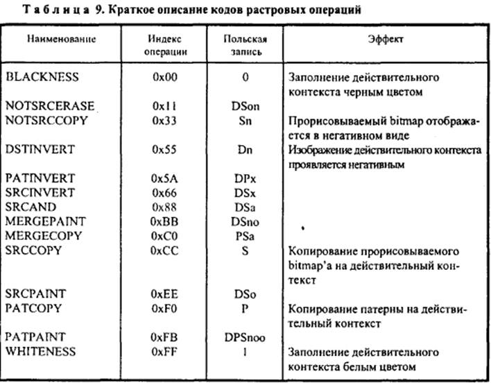 В документации по SDK имеется таблица, перечисляющая индексы 256 возможных растровых операций, их имена и короткое пояснение к каждой операции. Имена присвоены только 15 наиболее употребляемым операциям. Таблица, представленная в документации имеет следующий вид: