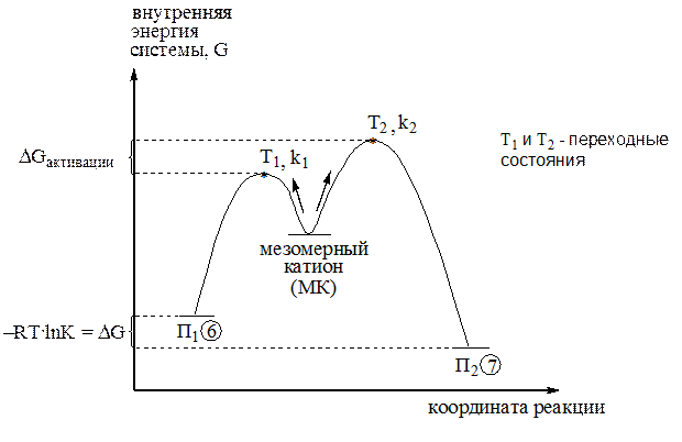 Благодаря меньшей энергии активации быстрее образуется продукт П1, и в начале реакции происходит его накопление в реакционной смеси. Образование продукта П2 происходит медленнее, так как энергия активации в этом случае выше. Образовавшийся продукт П1 может диссоциировать с образованием мезомерного катиона и поэтому постепенно переходит в термодинамически более устойчивый продукт П2. В пределе между ними устанавливается равновесие, обусловленное разностью свободных энергий (энергий Гиббса) продуктов ∆G. Достижение равновесного состава продуктов и означает термодинамический контроль (состава продуктов реакции). Таким образом, условием термодинамического контроля в строгом смысле этого понятия является обратимость реакций образования изомерных продуктов.