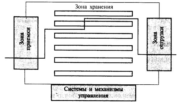 · зону приемки, куда товары поступают от поставщика и где они проверяются и сортируются;