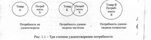 В нем показано, что товар А не удовлетворяет потребность X, товар Б удовлетворяет ее частично, а товар В - полностью. В этом случае товар В называется "идеальным товаром", восполняющим в нем все потребности.
