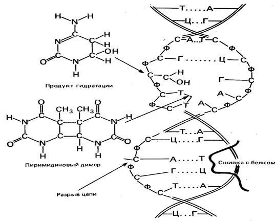 связей между цепями (тиминовые димеры и поперечные сшивки)