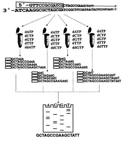 Главным этапом этого процесса является терминация построения комплементарной цепи ДНК. Она происходит при включении ДНК-полимеразой модифицированных аналогов природных субстратов дидезоксинуклеотид трифосфатов, являющихся ингибиторами ДНК-полимеразы. Рост цепи прерывается из-за отсутствие второго гидроксильного остатка в З'-положении рибозного кольца у дидезоксипроизводных и невозможности присоединения к ним следующего нуклеотида. Поскольку в четырех реакционных пробирках (по типу оснований – А, С, G и Т) присутствует огромное количество молекул секвенируемой ДНК, во много раз превосходящее ту длину фрагмента, которую могла построить ДНК-полимераза, то по теории вероятности каждое положение этого типа оснований во фрагменте ДНК оказывается представленным соответствующим ддНМФ.