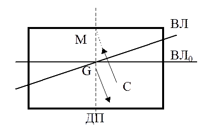 Сила тяжести приложена в ЦТ судна G и направлена перпендикулярно плоскости действующей ватерлинии ВЛ (ВЛ0 - начальная ватерлиния). Сила поддержания приложена в центре величины C и параллельна силе тяжести. При наклонении судна в воду входит некоторый объем (на рисунке - треугольник справа), а такой же по величине объем выходит из воды (слева). В результате ЦВ уже не лежит в ДП, а смещается в сторону наклонения. Точка пересечения линии действия силы поддержания и ДП М носит название «метацентр» и играет исключительно важную роль, поскольку от взаимного расположения метацентра и центра тяжести судна зависят величина (плечо) и знак восстанавливающего момента, возникающего при наклонении (крене) судна. В самом деле, при малых наклонениях равновесие судна будет устойчивым, т.е. судно будет иметь положительную остойчивость, если метацентр располагается выше ЦТ.