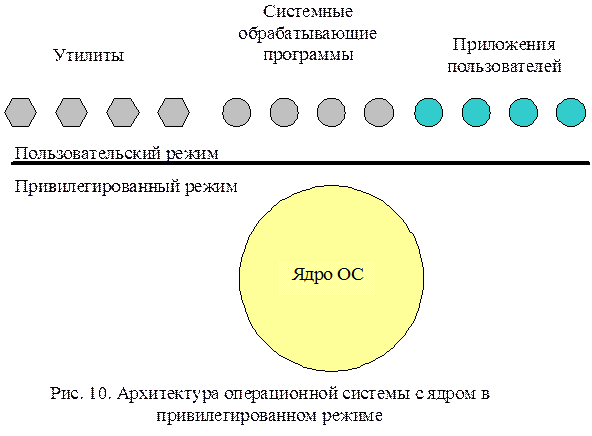 Так как ядро выполняет все основные функции ОС, то чаще всего именно ядро становится той частью ОС, которая работает в привилегированном режиме (рис. 10). Иногда это свойство — работа в привилегированном режиме — служит основным определением понятия "ядро".