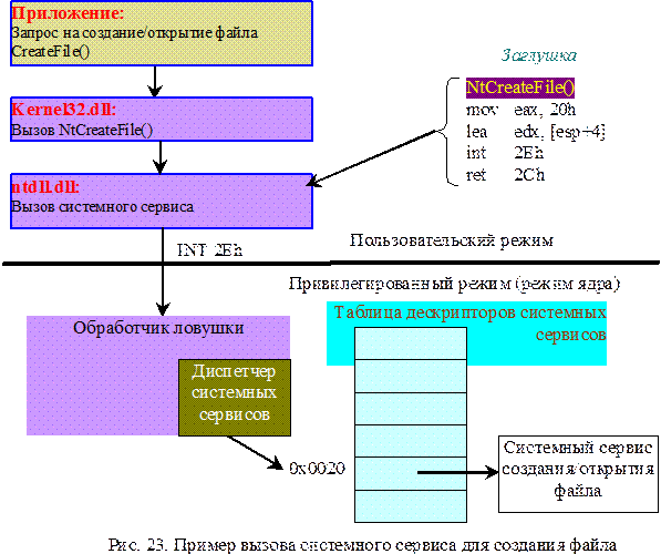 На рис. 23 иллюстрируется пример передачи управления от Win32-приложения, выполнившего вызов Win32-функции CreateFile(), библиотеке kernel32.dll, затем функции NtCreateFile() и Ntdll.dll и далее режиму ядра, где управление передается системному сервису, реализующему создание/открытие файла.