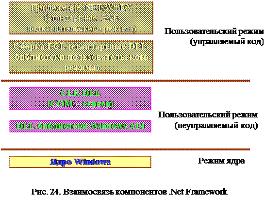 CLR реализована как классический СОМ-сервер, код которой хранится в стандартной Windows DLL пользовательского режима. Фактически все компоненты.NET Framework реализованы как стандартные Windows DLL пользовательского режима, занимающие уровень поверх неуправляемых функций Windows API. Взаимосвязи этих компонентов показаны на рис.24.