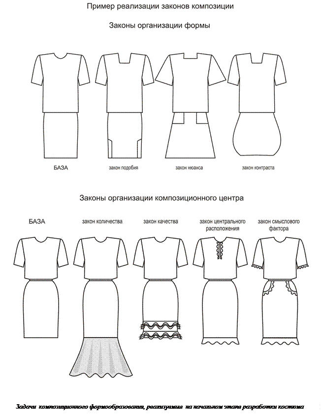 Костюм каждой группы будет выделяться посредством композиционного наполнения, регулируемого законами и свойствами композиции. Можно смело говорить о том, что комбинация законов центра композиции, формальной организации, свойств и качеств композиции позволяют получать бесчисленное множество вариантов художественного решения костюма.