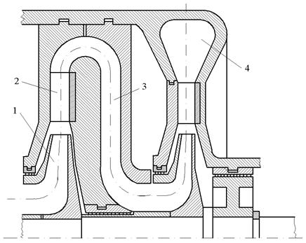 1 – рабочее колесо; 2 – диффузор; 3 – обратный направляющий аппарат; 4 – улитка
