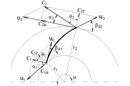 Рис. 20. Кинематика потока в колесе при угле βЛ2 < 90°