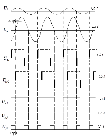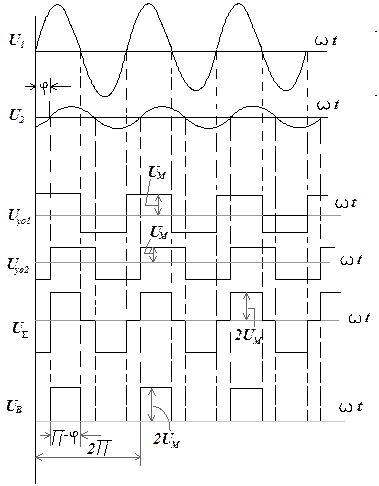 Блок-схема фазометра с формированием прямоугольных импульсов имеет следующий вид: