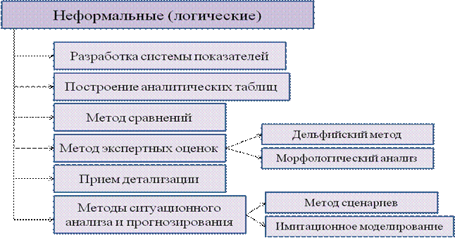Неформальные методы (вероятно, правильнее их назвать трудно формализуемыми) основаны на описании процедур на логическом уровне, без помощи строгих аналитических зависимостей. Большую роль в применении этих методов играют опыт и интуиция аналитика. Формализованные методы (иногда их еще называют математическими) опираются на предварительно заданные строгие зависимости и правила. Не все из них равнозначны по сложности используемого математического аппарата, возможности реализации в практической деятельности и степени распространенности в работе аналитических служб на предприятиях и специальных консалтинговых фирм.