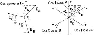 дают мгновенные значения этих величин в фазах, можно получить те же мгновенные значения, проектируя единый вектор на три оси времени, каждая из которых сопадает с магнитной осью соответствующей фазы (рис.3.33). Рис.3.33.