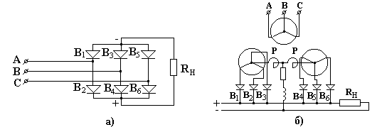 Примем, что для получения постоянного тока используютя современные схемы выпрямителей: трехфазная мостовая схема Ларионова (рис.5.5,а) или шестифазная схема две обратные звезды с уравнительным реактором (рис.5.5, б)