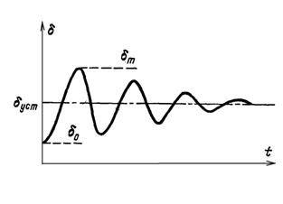 и угол δ между ними больше не возрастает. Однако процесс еще не останавливается, так как вследствие неравенства мощностей турбины и генератора на валу агрегата существует избыточный момент тормозящего характера, под влиянием которого частота вращения продолжает уменьшаться, и рабочая точка, характеризующая процесс на характеристике мощности, перемещается в обратном направлении к точке с. Эту точку ротор вновь проходит по инерции, и около точки b угол достигает своего нового минимального значения, после чего вновь начинает возрастать. После ряда постепенно затухающих колебаний в точке с устанавливается новый установившийся режим с прежним значением передаваемой мощности Р0 и новым значением угла δуст. Картина колебаний угла δ во времени показана на рисунке 12.4.
