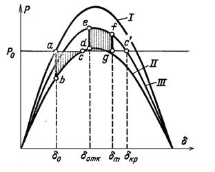 В результате на валу машины возникает некоторый избыточный момент, обусловленный избытком мощности ΔР(0) = Р0 – Р(0). Под влиянием этого момента ротор машины начинает ускоряться, увеличивая угол δ. В дальнейшем процесс протекает качественно так же, как и при внезапном отключении нагруженной линии. После нескольких колебаний с постепенно затухающей амплитудой относительное движение ротора прекратится и его положение будет определяться точкой с, являющейся точкой установившегося режима на новой характеристике мощности. Если бы ротор при первом отклонении прошел угол δкр, соответствующий мощности Р0 на подающей ветви характеристики II, то избыточный момент вновь изменил бы свой знак и сделался бы снова ускоряющим. С дальнейшим увеличением угла ускоряющий момент стал бы нарастать и генератор выпал бы из синхронизма.