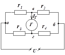 В мостах применяется мостовая ИСС, под которой понимается четырехполюсник, к двум входным зажимам которого (аб) присоединяется источник питания, к двум выходным вг – индикатор равновесия – гальванометр “ Г“. аб входная диагональ, вг - нагрузочная.