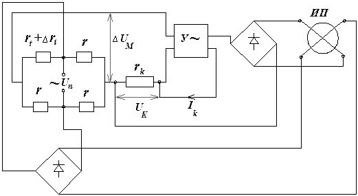 Представлена схема неуравновешанного моста, работающего в комплекте с термометром сопротивления