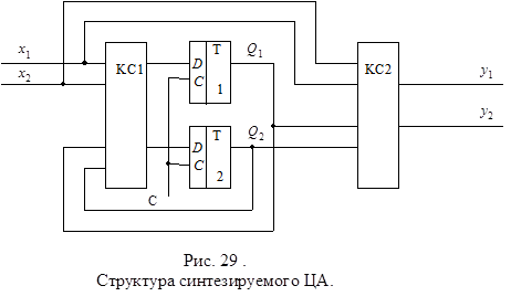 Следовательно, структура ЦА с учетом того, что исходный автомат является автоматом Мили, в качестве элементов памяти используется D -триггер, может быть представлена в виде(рис. 29):