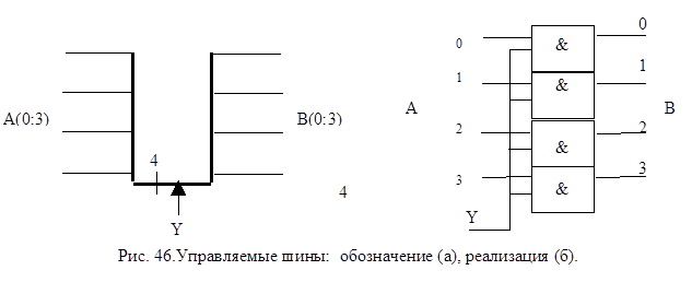 Под действием управляющего сигнала у управляемая шина выполняет микрооперации: у=0: B(0:3):=0, y=1: B(0:3):=A(0:3)