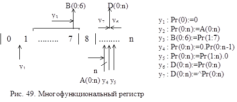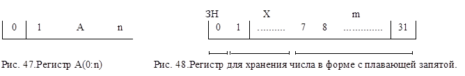 Регистр может состоять из отдельных подрегистров, имеющих самостоятельное значение (рис.48.). На рис.48 представлен регистр, хранящий число в форме с плавающей запятой. В этом регистре три подрегистра: для хранения знака Рг(0), характеристики Рг(1:7), мантиссы Рг(8:31) числа.