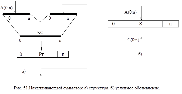Структура и условное обозначение накапливающего сумматора представлены на рис. 51.