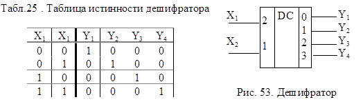 Дешифратор - операционный элемент, выполняющий функцию преобразования некоторого n-разрядного двоичного кода в унитарный код «один из N». Если N=2n - то такой дешифратор называется полным, если N<2n - то частичным. Таблица истинности простейшего полного дешифратора (n=2) и его условное обозначение приведены в табл. 25. и на рис. 53.