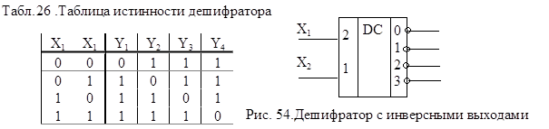 Промышленность может выпускать дешифраторы с инверсными выходами. Для такого дешифратора таблица истинности и условное обозначение имеют вид (табл. 26., рис. 54.)