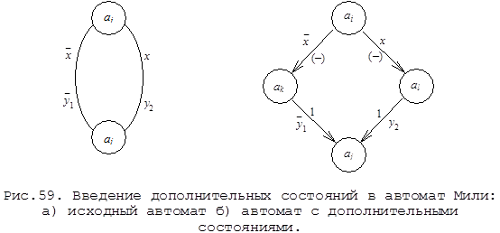 В исходном автомате (рис. 59.а) есть переходы из аi в аj под действием сигналов х и х с выработкой y 1 и y 2 соответственно и имеет место х = f (y 1, y 2). Действительно, введение вспомогательных состояний а k и а l позволяет устранить возможную ошибку в выдаче выходных сигналов. На переходах аi аk или аiаl выходные сигналы не вырабатываются. Переходы аi аk или аiаl являются безусловными с выработкой y 1 или y 2 соответственно. В таком случае изменение значения х, в результате выполнения микроопераций y 1 или y 2, не повлияет на выходной сигнал, вырабатываемый автоматом, так как на переходах аi аk или аiаl выходной сигнал уже не зависит от х.