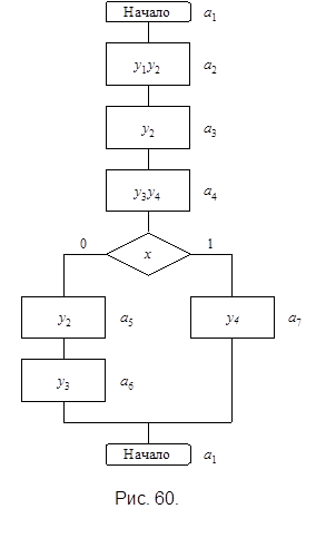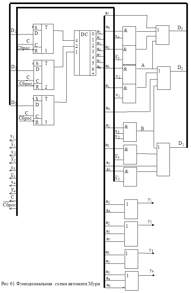 писанного в семиразрядном регистре. Этим и объясняется название метода. Функциональная схема автомата Мура, построенная по полученным уравнениям, приведена на рисунке 62. При определенных навыках синтез автомата Мура на базе регистра сдвига выполняется непосредственно по отмеченной ГСА без построения структурной таблицы переходов-выходов.