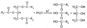 1. Гидролиз жиров в кислой среде приводит к образованию глицерина и набора жирных кислот, по которому судят о сорте жира, его аутентичности декларируемому продукту: