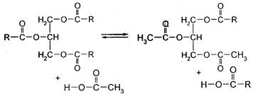 Ацидолиз, например, кокосового жира с последующей этерификацией избытка уксусной кислоты глицерином, приводит к образованию смеси, состоящей из лауроилдиацетина, миристоилдиацетина и других смешанных триглицеридов, применяемой в качестве мягчителя нитроцеллюлозы. Большое практическое значение имеет реакция двойного обмена ацильными радикалами в триглицеридах (переэтерификация), протекающая как внутри-, так и межмолекулярно, и приводящая к перераспределению остатков жирных кислот.