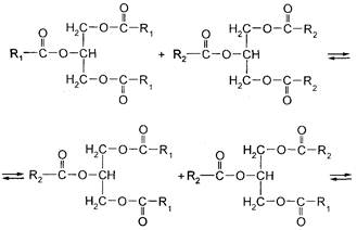 7. Межмолекулярная переэтерификация жиров в однофазной жидкой системе (ненаправленная переэтерификация) приводит к статистическому перераспределению кислотных остатков в образующейся смеси триглицеридов. Направленная (многофазная) переэтерификация осуществляется при такой температуре, при которой высокоплавкие триглицериды находятся в твердом, а низкоплавкие - в жидком состоянии. При направленной переэтерификации отдельные жировые фазы обогащаются наиболее высокоплавкими и наиболее низкоплавкими триглицеридами. Ненаправленная и особенно направленная переэтерификация натуральных жиров используется для изменения их физических свойств - температуры плавления, застывания, пластичности, вязкости жиров. Ниже приведена схема реакций переэтерификации:
