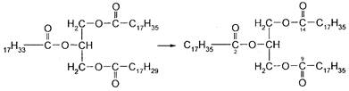 1. гидрированием полиненасыщенных кислот, например, линолевой, до мононенасыщенной олеиновой и последней - до насыщенной стеариновой;