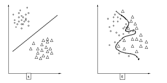 На первый взгляд кажется, что знание всего лишь некоторого количества точек из области недостаточно, чтобы отделить всю область. Действительно, можно указать бесчисленное количество различных областей, которые содержат эти точки, и как бы ни была построена по ним поверхность, выделяющая область, всегда можно указать другую область, которая пересекает поверхность и вместе с тем содержит показанные точки. Однако известно, что задача о приближении функции по информации о ней в ограниченном множестве точек, существенно более узкой, чем все множество, на котором функция задана, является обычной математической задачей об аппроксимации функций. Разумеется, решение таких задач требует введения определенных ограничений на классе рассматриваемых функций, а выбор этих ограничений зависит от характера информации, которую может добавить учитель в процессе обучения. Одной из таких подсказок является гипотеза о компактности образов. Интуитивно ясно, что аппроксимация разделяющей функции будет задачей тем более легкой, чем более компактны и чем более разнесены в пространстве области, подлежащие разделению. Так, например, в случае, показанном на Рис. 2а, разделение заведомо более просто, чем в случае, показанном на Рис. 2б. Действительно, в случае, изображенном на Рис. 2а, области могут быть разделены плоскостью, и даже при больших погрешностях в определении разделяющей функции она все же будет продолжать разделять области. В случае же на Рис. 2б, разделение осуществляется замысловатой поверхностью и даже незначительные отклонения в ее форме приводят к ошибкам разделения. Именно это интуитивное представление о сравнительно легко разделимых областях привело к гипотезе компактности.