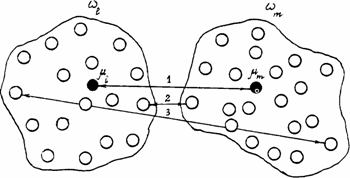 Рис. 11. Различные способы определения расстояния между кластерами wl и wm: 1 - по центрам тяжести, 2 - по ближайшим объектам, 3 - по самым далеким объектам