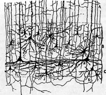 Рис. 2.1. Схематический рисунок клеток головного мозга, выполненный известным испанским анатомом Сантьяго Рамон-и-Кахалем, лауреатом Нобелевской премии за исследования в области нейронауки. На этом рисунке, сделанном на основе тщательных наблюдений при помощи микроскопа, показана сложная сеть нервных клеток в головном мозге человека