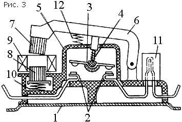8 - катушка электромагнита; 9 - магнитопровод электромагнита; 10 - амортизирующие пружины; 11 - тепловое реле; 12 - отключающая пружина.